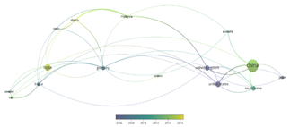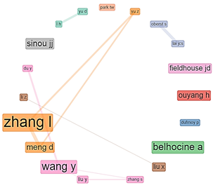 Fig. 13 shows the relationship in collaborative networks between authors; small collaboration groups can be observed, one of them is the orange one made up of Zhang I, Meng D and Yu Z, and the pink color Wang Y, Du Y, Ilu Y, and Zhang Y, the other groups are based on authors working in pairs or alone without collaboration on groups of articles.