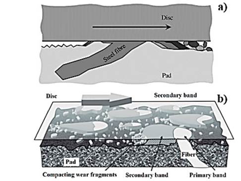 Wear particles or debris are generated from the friction of the disc brake due to wear developed from the contact between the pad and the disc. Eriksson presented an explanatory model of the contact situation between an organic brake pad complex and a cast-iron disc; Osterle and Ostermeyer present similar results. From Fig. 2, metallic fibers or other hard particles (debris) are shown in the material pad, forming stable primary plateaus or patches, leading to the main part of the applied load in the contact pressure [7].