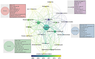 On the other hand, Fig. 7 shows the 10 common keywords and the frequency of appearance according to the results obtained. The most frequent keyword is brakes, followed by friction and finite element analysis; these words appear in English because they are the most used language in publications. The interaction between the use and frequency of appearance between the keywords is shown in Fig. 8; notice that of the 2,377 keywords found, at least 20 words appear 9 times in publications, attributing a higher appearance after 2006.