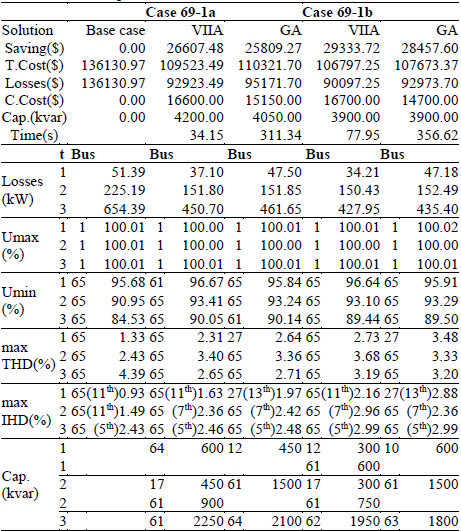 In the second case (69-2b), the proposed solution is inferior in 3.7% and uses the 103.7% of capacitor units with respect the GA’s solution. The solution is obtained in the 18.8% of the GA’s computation time.