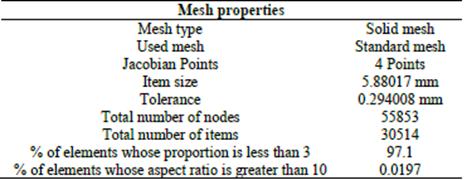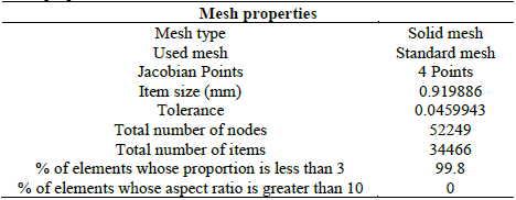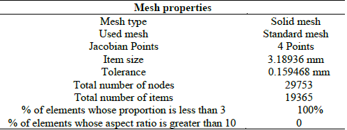 The percentage of elements whose proportion is less than 3 is 100%, which means an excellent type of mesh, due to the part's geometry. (Table 7)