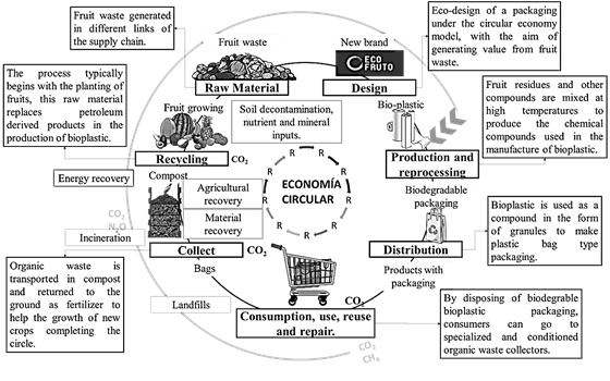 This article presents a circular economy model corresponding to the current state of fruit waste in Colombia and the impact that is being generated at a social, economic and environmental level. This model proposes the manufacturing of bioplastics based on fruit waste in order to minimize the consumption of fossil resources, carbon footprint and production cost. It also contributes to the generation of employment in the different links of the supply chain, as well as recovering the value of fruit residues through packaging manufacturing. The construction of the model was based on the identification of causes associated with the low recovery of value of fruit residues, through the review of secondary sources, which were later validated with the Delphi method.