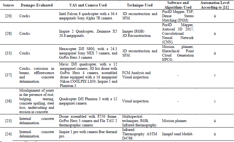 Inspections performed manually on bridges by means of visual inspection techniques are expensive, risky, time-consuming and require the expertise of highly qualified inspectors, which produces a high degree of subjectivity in the data analysis process and decision-making for maintenance. Additionally, equipment, such as ladders, ropes and lifting baskets mounted on land or water vehicles are required to inspect areas that are difficult to access [3,21,33]. Due to the large size of certain structures, there is a high risk derived from working at heights. For this reason, [20] presents the need for an intelligent and precise technique to perform a Structural Health Monitoring (SHM) study. Methods based on emerging technologies and digital techniques, combined with the use of UAS equipped with cameras and sensors of various types, allow evaluating and monitoring bridges' structural conditions through image-based approaches as a source of information.