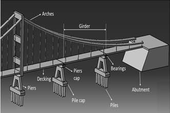 Although there are a variety of bridges, they are usually divided into three major sections: i) foundation, ii) substructure and iii) superstructure. The foundation contains the piles that provide support and a solid base for the bridge. They also transmit the weight and loads to the terrain. The caps, which are made of concrete and contribute to transferring loads to the ground, are located above the piles. The abutments are found in the substructure. These are vertical walls located at the ends of bridges, which retain the soil around the bridge [21]. If the bridge is composed of several sections, as shown in Fig. 1, pier and pier caps are located at the ends of each section to support the sections and disperse vibrations produced by traffic crossing the bridge. The decks that directly support the traffic loads are located in the section called the superstructure. These elements are attached to the pier caps through bearings. The last ones transfer loads from the decks to the substructure.