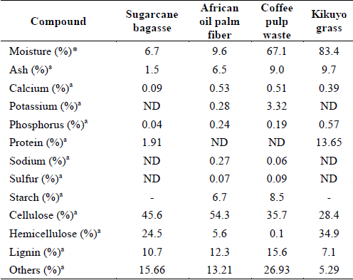 The composition of the lignocellulosic materials used in this study is shown in Table 2. The main fractions of sugarcane bagasse were in the range of reported content for lignin (10-28%), cellulose (20-46%), and hemicellulose (20-33%) of the same material [5,27,29,42,43]. For African oil palm fiber, similar contents of lignin and cellulose were found to those values reported of palm oil solid wastes. Lignin (10-28.8%), hemicellulose (17-22.8%), and a higher percentage of cellulose (36.7-54.4%) than other sources of biomass such as sugarcane bagasse, rice straw, and corn cobs have been registered [10,30,31,44-46]. Regarding the composition of coffee pulp waste, the main fractions of lignin and cellulose were in the range of lignin (11.7-16.85%) and cellulose (8.6-53%) contents respectively, but the hemicellulose content (0.1%) was lower than the reported values (11-36.7%) [2,9,33,47]. Finally, the kikuyo grass had a higher content of lignin, cellulose, and hemicellulose than the values found for the same biomass. The lignin (5.6-5.9%), cellulose (26.9%), and hemicellulose (26.2%) contents were reported [8,13]. Variations in the composition can be related to different growing conditions, species, times of harvesting, processing of samples, among others [14]. From this initial characterization, the content of cellulose and hemicellulose highlights the potential of the selected agricultural residues to produce fermentable sugars, bioethanol, and other high-value bioproducts through their fractionation or hydrolysis. For instance, theoretical ethanol yields can be broadly estimated to show their big potential [57].