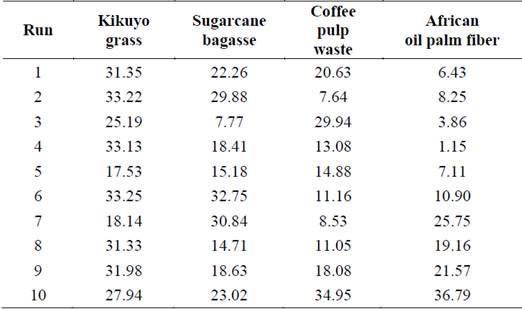 From the results of Table 3, the treatment process that provided the highest removal of lignin was 10 (36.79%) for African oil palm fiber when the lowest level of factors: temperature (40 ºC), stirring rate (0 rpm), average particle size (0.45 mm), and alkali concentration (0.1 g Ca(OH)2/g-dry matter) were assessed at the high liquid to solid ratio (28 ml/g-dry matter). A similar result (34.95%) was obtained when coffee pulp waste was treated under the same operational conditions. On the other hand, the highest removal of lignin from kikuyo grass (33.25%) and sugarcane bagasse (32.75%) was achieved using the lowest level of temperature, stirring rate, average particle size, and liquid to solid ratio (12 ml/g-dry matter) while the alkali concentration had the highest value (0.5gCa(OH)2/g-dry matter), corresponding to the treatment process 6.