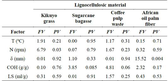 The variance analysis (ANOVA) of a single factor for the %RL is shown in Table 4. This analysis allowed us to identify factors of significance or impact on the alkaline delignification of the lignocellulosic materials.