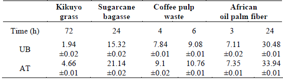 After hydrolysis, the highest concentration of reducing sugars (RSs) was obtained with the pretreated biomass over a relatively short time interval. Concentrations of 21.14, 10.76, 33.94, and 4.66 g/l were measured for sugarcane bagasse, coffee pulp waste, African oil palm fiber, and kikuyo grass, respectively. This is associated with the cellulose content of these materials, 45.6, 35.7, 54.3, and 28.4%, respectively.