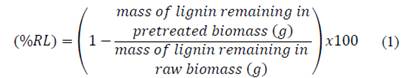 Table 3 shows the percentage of lignin loss (%RL) after the pretreatment process. The optimal pretreatment parameters and overall trends can be identified for each lignocellulosic material.