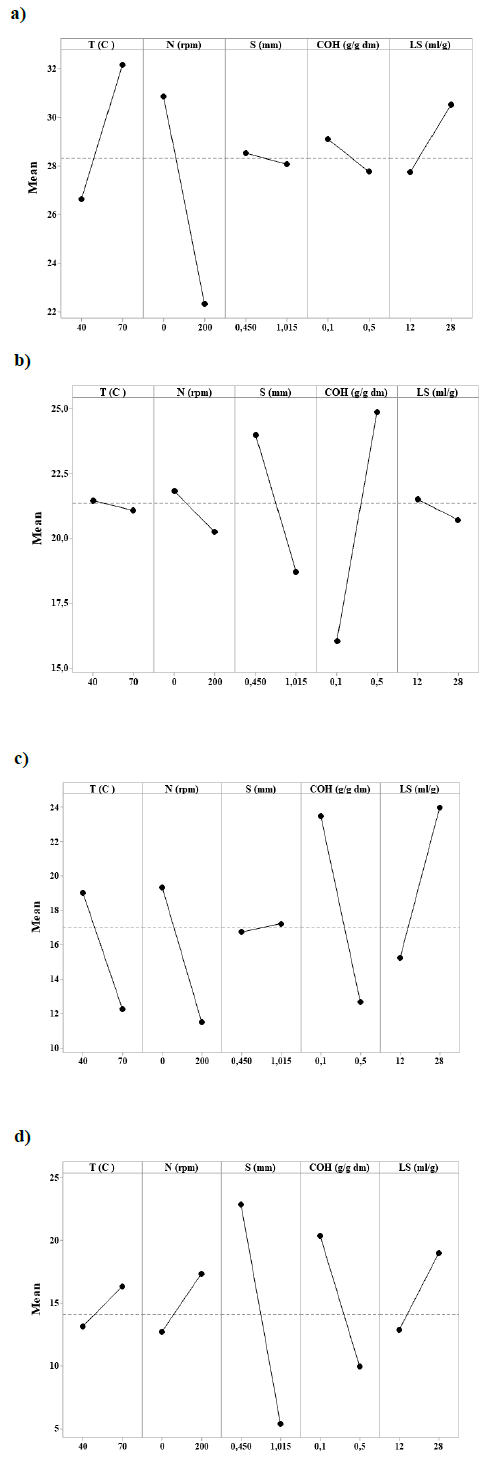 Figure 1: Main effects of factors on the removal of lignin with lignocellulosic materials. a) Kikuyo grass, b) Sugarcane bagasse, c) Coffee pulp waste, and d) Fiber of African oil palm. Where “dm” refers to dry matter, and “S” corresponds to the particle size (δ) used in Table 1.