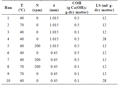 Twenty samples (dry matter) of each biomass were placed in autoclaved 225 ml Erlenmeyer flasks, corresponding to duplicate treatments. Distilled water was used to achieve the liquid to solid ratio of the experimental design shown in Table 1. Two temperature levels (40 and 70°C), two alkali concentrations (0.1 and 0.5 g Ca(OH)2/g-dry matter), two liquid to solid ratio levels (12 and 28 ml/g-dry matter), two stirring rate levels (0 and 200 rpm), and two average particle size levels (0.45 and 1.015 mm) were considered. The removal of lignin (%RL) from the treated biomass was defined as the response variable. The pretreatments were conducted for 24 hours. The evaluated variables and levels were selected according to the literature [19,20,24-29]. After the pretreatment time elapsed, the Erlenmeyer flasks were immersed in cold water to cool them. The pretreated biomass was filtered out and washed with distilled water until the pH was between 7 and 8. Then, they were dried at 45°C to constant weight for 72 hours. Subsequently, these samples were cooled at room temperature and stored at 4°C in zipper plastic bags [26,30,31]. The resulting pretreated material was mainly characterized by determining the moisture and lignin content.