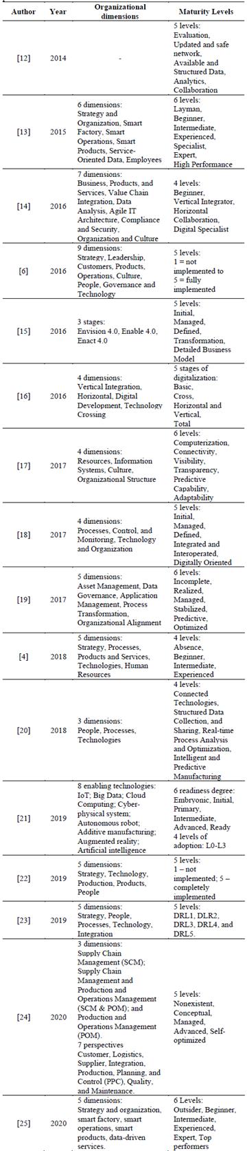 In addition to the models shown in the Table 3, other models present in the bases are also noteworthy, such as [40] model with 3 maturity levels; [35] with 4 levels; [33, 36, 38, 39, 41, 44] that present their frameworks with 5 maturity levels. The [42, 37, 34] models have 6 levels. Regarding the enterprise type, [35] applies to retail sector, [36] applies to SME, [42] to Automotive Industries and [43] to Bank enterprise.