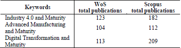 The WoS and Scopus platform provide the most cited keywords, within the set of analyzed papers, after inserting the terms Industry 4.0 and Maturity. As expected, the most frequent keyword is Industry 4.0 with 13 quotes in WoS and 14 quotes in Scopus. The keyword Maturity Model appears in sequence with 7 quotes in WoS and 13 quotes in Scopus. Other keywords cited are Digitization, Digital Transformation, Smart Factory, Internet of Things, and Learning Factory, among others.