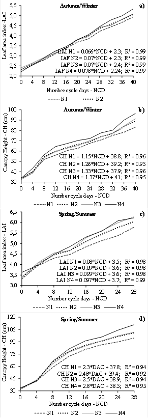 Figure 4: Guinea grass: empirical models for estimation as a function Number cycle days (NCD) for: (a) LAI autumn/winter, (b) CH autumn/winter, (c) LAI spring/summer and (d) CH spring/summer. Piracicaba-SP, Brazil, 2017/18.