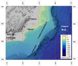 Based on the distribution of seismicity, the main active seismic areas in Brazil were delineated by [1] as follows: (1) Southern part of the Guyana shield and middle Amazon basin; (2) a North-South-trending zone along the Eastern border of the Amazon craton; (3) Northern part of the Borborena Province, in Northeastern Brazil around the Potiguar marginal basin; (4) the Porto dos Gauchos seismic zone; (5) a NE-SW zone in the Tocantins province possibly continuing towards the Pantanal Basin; (6) Southern Minas Gerais zone, in and around the southern tip of the São Francisco craton; and (7) the Southeast offshore zone with activity concentrated along the continental slope from the Pelotas Basin in the south to the Campos basin from 33°S to 20°S [2,3]. The Campos Basin represents an important pole in Brazilian economy and is one of the most prolific Brazilian oil-producing basins [4]. Given the importance of the Campos Basin, moderate seismicity in the oceanic portion of the Southeast region (magnitude 5 every 10-30 years and potential occurrences of magnitude up to 7) represent a hazard to the design of offshore infrastructure developments. The area of interest for the analyses presented in this work correspond to the continental margin of Southeastern Brazil. Specifically, the Campos Basin Continental Slope [6], offshore the state of Rio de Janeiro (Fig. 1).