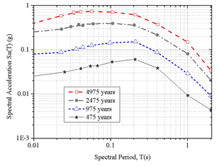 Figure 3: Uniform Hazard Response spectra for the site of interest at the continental slope of the Campos Basin for various return periods.