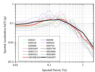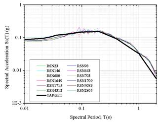 The search results are shown in Table 2, 3, a total of twelve records were found. The response spectra of the scaled ground motions are presented in Fig. 4 including the geometric mean of the results. The process of searching and scaling the accelerograms returned a series of results that on average are compatible with the target response spectrum.