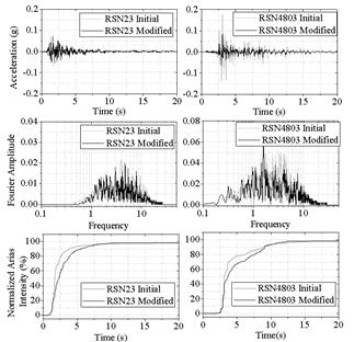 As an example of the matching process in terms of the target response spectra, Fourier spectra, and Arias intensity, two earthquakes from Table 2 were selected. Arias Intensity (energy content) was included in the comparison of the matched records, considering its importance in seismic hazard analysis [44]. Fig. 5 shows the acceleration time-histories, Fourier spectra and Arias Intensities of the recorded and matched time series of earthquakes RSN 23 and RSN 4803. The Fourier amplitude maintains the characteristics of the initial time series. In addition, a good agreement was observed between the normalized Arias intensities of the initial (measured) and the modified (spectrally matched) time series. The same procedure was employed for all the records shown in Tables 2, 3 and the spectral matching results are presented in Fig. 6.