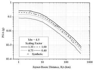 Fig. 7 presents a comparison between the Peak Ground Accelerations (PGA) obtained from the synthetic accelerograms versus distance and the curve obtained from the Ground Motion Prediction Equation (GMPE) developed by [51] and modified by [52], for the stable continental region in Central and Eastern North America (curve for a scaling factor equal to 1.00 in Fig. 7). Considering that Brazil is in an intraplate setting of low attenuation, [5] adopted [51] and [52] GMPE for the probabilistic hazard assessment in the continental margin of Southeastern Brazil. Additional curves were generated using Scaling Factors (SF) to cover the range of possible seismic attenuation in Brazil (SF = 0.4, 0.75, 1.00, 1.33). From Fig. 7, it can be observed a good agreement in terms of the PGA values obtained from the synthetic accelerograms and the curves obtained from GMPE.
