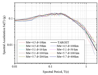 Figure 4: 5% response spectra for the scaled accelerograms and target spectra.