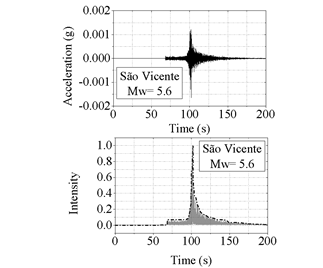 Figs. 12 and 13 present the acceleration time-histories and the associated envelope shapes of the recorded motions. It can be observed that low accelerations were recorded from the São Vicente earthquake, this is due to the distance between the station and the epicenter (around 313.8 km). The Montes Claros earthquake, on the other hand, was recorded by a station located at 1.44 km of the epicenter, then, relatively higher accelerations can be observed.