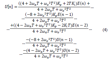 Through different mathematical calculations, the damping factor and the natural frequency of the second order system is equalized with both the desired characteristic polynomial and the characteristic closed-loop polynomial, resulting in the controller constants Kp = 0.04183 and Ki =252.29. Since the controller must be discretized to be implemented in a microcontroller, the bilinear transformation or Tustin method [13] was used to calculate the values. Eq. (3) and eq. (4) were used, where T is the sample time of the controller, U[n] is the actual control signal in discrete time, and E(n) is the actual error as a result of the subtraction between the reference signal and the sensed voltage signal at the output.