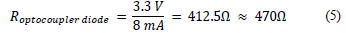 The circuits using MOSFETs controlled by microcontrollers must have an isolation stage between the devices that drive AC signals and the digital circuit that sends the signals for the on/off of the switching devices. An ACPL-4800 optocoupler was used which is comprised of Gallium Arsenide Phosphide GaAsP along with a Schmitt trigger gate that allows for fast switching in state transitions. It has a power range of 4.5 V to 20 V, a maximum pulse width distortion equal to 250 ns, a maximum current at a 25 mA output, and a maximum propagation delay of 150 ns [18]. In practical terms, in the input of the optocoupler will enter a 3.3 V signal generated by the microcontroller. Eq. (5) shows the calculation of the resistor connected between the internal diode of the optocoupler and the generated signal by the microcontroller taking into consideration that the optocoupler supports a maximum current of 8 mA which is less than what is specified in the datasheet.