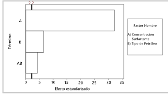 Ahora bien, se pudo corroborar que existen diferencias altamente significativas entre la concentración de surfactante y el tipo de hidrocarburo con respecto al índice de emulsificación, con valores (p<0.000), a un nivel de confianza del (p<0.005). Además, la interacción entre los dos, la concentración de surfactante y el tipo de petróleo también presenta efecto significativo con valor (p<0.002). Esto puede apreciarse en el diagrama de Pareto de efectos estandarizados establecido en la Fig. 1. Este permite identificar en qué medida los componentes rigen el comportamiento de una variable, observando que el parámetro con mayor efecto es la concentración del surfactante, seguido por el tipo de hidrocarburo y en menor medida la interacción de ambos.