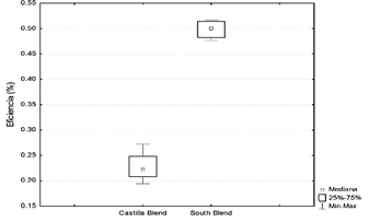 Estos resultados exponen claramente la eficiencia de la mezcla surfactante natural sobre los crudos de prueba. La Fig. 2 muestra que para Castilla Blend se dispersó un 23 % del crudo total y para South Blend un 50 % del total, lo que revela una diferencia altamente significativa (p<0.0001) entre los dos crudos cuando se aplicó la prueba de T test para muestras independientes.