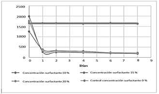 Con respecto a la actividad emulsificante del surfactante natural frente a los hidrocarburos empleados, debe señalarse que la concentración del surfactante se relaciona directamente con la formación de micelas en el medio, lo cual facilita la emergencia de los fenómenos de emulsificación y de unión a iones metálicos. Estudios realizados concuerdan con los resultados obtenidos, donde se analizó el comportamiento de una emulsión ante cambios en concentración para los emulgentes (Twen 80) y Lipófilo (Span 83). En ese orden de ideas, se encontró que, gracias al incremento en la concentración del emulgente, se reduce la estabilidad de la emulsión, pues la viscosidad de la película interfacial disminuye al aumentar la solubilidad de esta y hace que se rompan las gotas de aceite de manera fácil [15]. Además, la capacidad emulsionante de surfactantes de origen vegetal también ha sido demostrada en investigaciones sobre la lecitina de soja sobre hidrocarburos, encontrado, para concentraciones de 5 % en peso, valores de índice de emulsificación de 22 % [16].