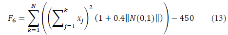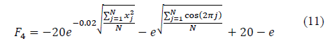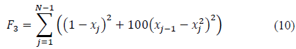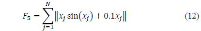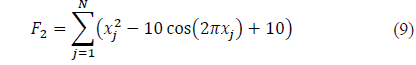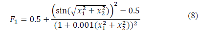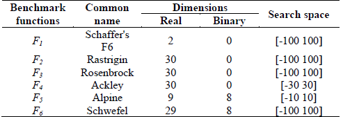 The benchmark functions were: eq. (8) (Schaffer's F6), eq. (9) (Rastrigin), eq. (10) (Rosenbrock) [14], eq. (11) (Ackley), eq. (12) (Alpine) [13], and eq. (13) (Schwefel) [8]. These functions were tested with the conventional and modified PSO algorithms for minimization problems with the characteristics shown in Table 1, where the type and number of dimensions of each function are also detailed. For the evaluation of the hybrid algorithms with the benchmark functions (whose inputs are originally real dimensions), the binary dimensions were mapped to the real search space using eq. (14) [17].