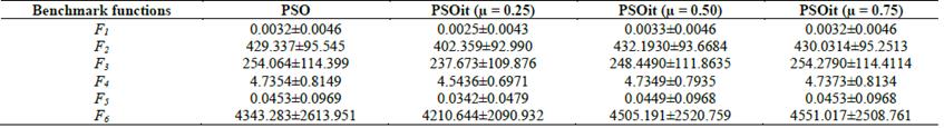 Table 2 shows the results of the mean and standard deviation of the global best responses from the benchmark functions after 100 repetitions, which were obtained through the optimization with PSO and PSOit for the different mean values of the distribution. In these cases, the PSOit method’s performance was similar or better than PSO for the three mean values, and the mean equal to 0.25 had the best results, i.e., it reported the lowest mean and standard deviation of the global best response for all the benchmark functions.