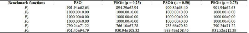 Table 3: Results of the number of iterations with the process of optimization from the PSO and PSOit with a normal distribution (σ = 0.1).