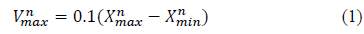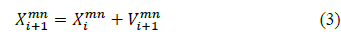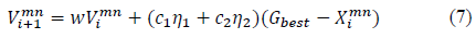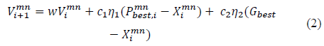To update the velocity of particle m and dimension n, eq. (2) is employed, where the value of the best response of the particle is P mn best,I for each iteration i and particle m; the best response of the swarm is G best , and the position of the particle m, dimension n, and iteration i is X mn i This value must be between a maximum (V n max ) and a minimum (-V n max ) [14].