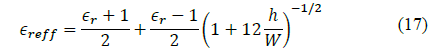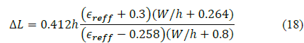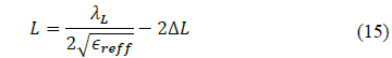 In this experiment, the control variables for optimization were the length and width (L and W, respectively) of the antenna’s resonant patch. The selected lower and upper boundaries for these variables were 8.8 mm ( L ( 48.8 mm, and 7.3 mm ( W ( 67.3 mm. Furthermore, the size of the feeding microstrip was kept constant and equal to a quarter of the wavelength. The calculated initial variables were L= 28.8 mm and W = 37.3 mm. These values were obtained through eq. (15), (16), respectively, where λL is the wavelength of the minimum frequency, ϵreff is the effective relative electrical permittivity that is defined by eq. (17), and ΔL is a distance according to eq. (18) [19].