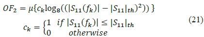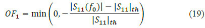 The objective function that allows the minimization of the S 11 magnitude in the central frequency was eq. (19), where |S 11(f 0)| is the S 11 magnitude at the central frequency f 0=2.45 GHz, and |S 11|th is the threshold magnitude equal to -10 dB [20]. The maximum consecutive number of iterations for the convergence criterion was 80 [14].