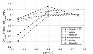 Additionally, Fig. 4 shows the results of the benchmark functions obtained with PSOit, normalized in terms of the response of the conventional PSO for different means of the decision factor distribution. It is noted that the normalized responses with a mean value of 0.25 had a reduction between 4 and 24.4% in comparison with the PSO responses. PSOit showed a better quality of solution than the conventional PSO with these parameters.