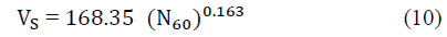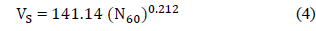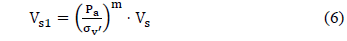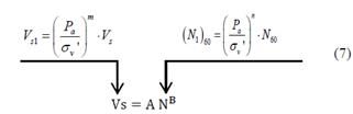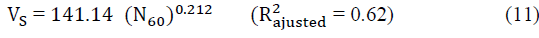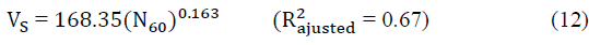Eq. (11) is the correlation N60 - Vs. Eq. (12) is the correlation of N60-Vs, including the effective overload correction to Vs and N60, the latter was determined with a multiple linear regression model. The hypothesis of the model was verified in Item 3.4: