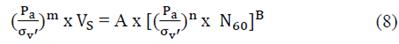 Where: σv' is the effective overload stress, Pa is the admospheric pressure and values of n and m are the differences in the way that Vs and N60 are corrected for effective overload. Replacing (N₁)60 and VS1 in the potential equation Eq. (7), Then expressing in terms of natural logarithms and ordering, the linear equation Eq. (9) in two variables is obtained (ln N60 and ln