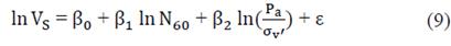 Figure 10: Ln(VS) Versus Ln(N60) and Ln (Pa/σ'V) for sands.
