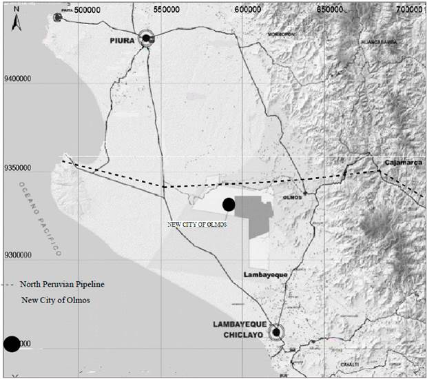 The study area is located in the district of Olmos, province and department of Lambayeque, Peru. The “La Nueva Ciudad de Olmos” project was developed in a program created by the Ministry of Housing, Construction and Sanitation, with the aim of creating a planned and self-sustaining city with modern urban planning criteria, to be replicated in new processes of urbanization in Peru.