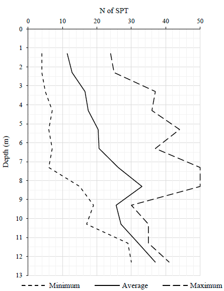 SPT remains the most current test for geotechnical site characterization. The test is simple and provides a sample of disturbed soil while measuring resistance to penetration [33]. Fig. 4 presents the compilation of the SPT tests, these present a record up to a depth of 7.00 to 12.0 m, generally the number of SPT blows is less than 30, corresponding to poorly graded sands of loose compactness to moderately dense. Some SPT tests reach a number of blows greater than 30, corresponding to the dense compact sand layer and associated with the ancient Pleistocene eolian deposit.