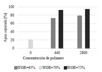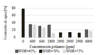 La Figura 11, presenta el reporte de contenido de agua dispersa en la fase oleosa separada de la emulsión inicialmente formada, posterior al proceso de separación de 24 horas, donde se observan que con aumento en la concentración de polímero disminuye el contenido de agua separada.