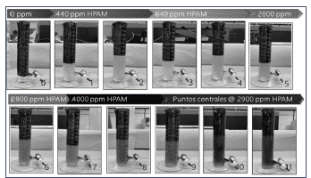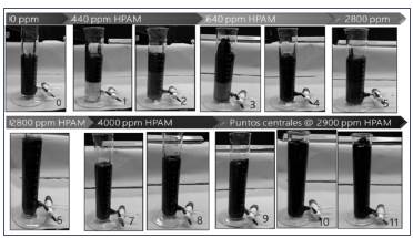 Se prepararon 11 emulsiones crudo-solución polimérica en una probeta de salida lateral. Por medio de un Ultra Turrax se mantuvo el crudo en agitación a 13500 rpm mientras se adicionaban 5 ml de la fase acuosa cada 30 segundos de acuerdo con la relación crudo: agua requerida. En la Figura 1, se observan fotografías de los fluidos, 3 horas posteriores al proceso de agitación. En este tiempo se evidenció una estabilidad relativa, en donde no se observaban cambios significativos en las fases. En este punto se procedió a aplicar rompedor directo y antiespumante y conservar las muestras a 40 °C, con el fin de permitir el proceso de separación gravitacional del crudo por un tiempo de 24 horas (Figura 2).