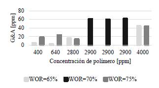 El diagrama de Pareto de la Figura 8. muestra que el incremento en el TDS y la viscosidad de la solución polimérica, tiene una influencia positiva sobre el contenido de G&A. Como se discutió en la sección anterior estas variables determinan la concentración de polímero en solución. La Figura 9, muestra que la cantidad de G&A aumenta con el incremento de la concentración de polímero residual. Esto refleja que a pesar de que existe una mayor cantidad de agua separada de la emulsión inicial conforme aumenta la concentración de polímero en solución (Fig. 3-6), la calidad de la fase acuosa disminuye, siendo más evidente este comportamiento para concentraciones de polímero superiores a 2800 ppm.