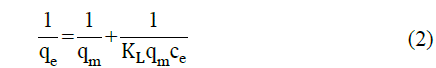 According to the Langmuir model, the adsorption of a substance is due solely to the formation of a monolayer, where all the adsorption sites are equivalent and the ability of a molecule to be adsorbed in a determined site is independent of the occupation of neighboring sites since no interaction exists among the adsorbed molecules [30-32]. The linearized form of the model is described by Equation (2):