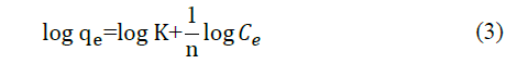 Where: qe is the mass of adsorbate per unit of mass of the adsorbent (mg/g); K and n are the Freundlich constants, the first related to the relative capacity of the adsorbent (mg/g) and the second related to the intensity of the adsorption process (dimensionless); and Ce is the concentration of the solute in equilibrium (mg/L).