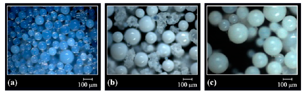 Figure 4: Optical micrographs of the resins (a) GMA-DVB(7:3)(2)S, (b) GMA-DVB(6:4)(2)S and (c) GMA-DVB(8:2)(2)S obtained by direct sulfonation with sulfuric acid.