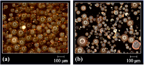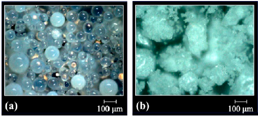Figure 5: Optical micrographs of the resins (a) STY-DVB(7:3)(2)S and (b) STY-DVB(7:3)(3.5)S obtained by direct sulfonation with sulfuric acid.
