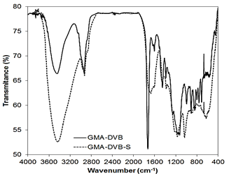 Fig. 6 presents the spectra of the resins based on glycidyl methacrylate (GMA). The increased intensity and widening of the band at 3450 cm-1 can be attributed to the elongation of the O-H bond. The appearance of this band can be the result both of the opening of the epoxide ring during the sulfonation reaction and the presence of hydroxyl in the sulfonic acid group. The bands at 811 and 910 cm-1 are associated with the symmetric and asymmetric deformation of the epoxide ring. It can be noted, albeit with some difficulty, that these bands were preserved in the spectrum after sulfonation, despite the intense overlap of other bands.